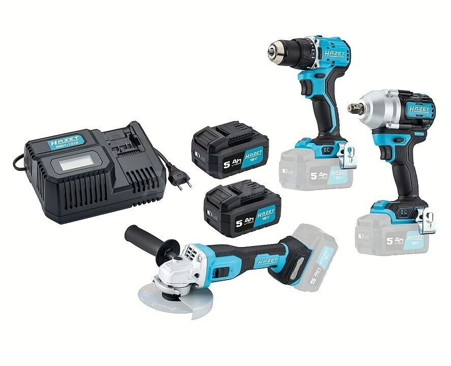 Sada aku nářadí Hazet – vrtačka, rázový utahovák, úhlová bruska, 2x aku, nabíječka. 5Ah akumulátory (18 V), aku vrtačka se sklíčidlem 1,5–13 mm, rázový utahovák s max. momentem 950 Nm, úhlová bruska s otáčkami 10.000/min.