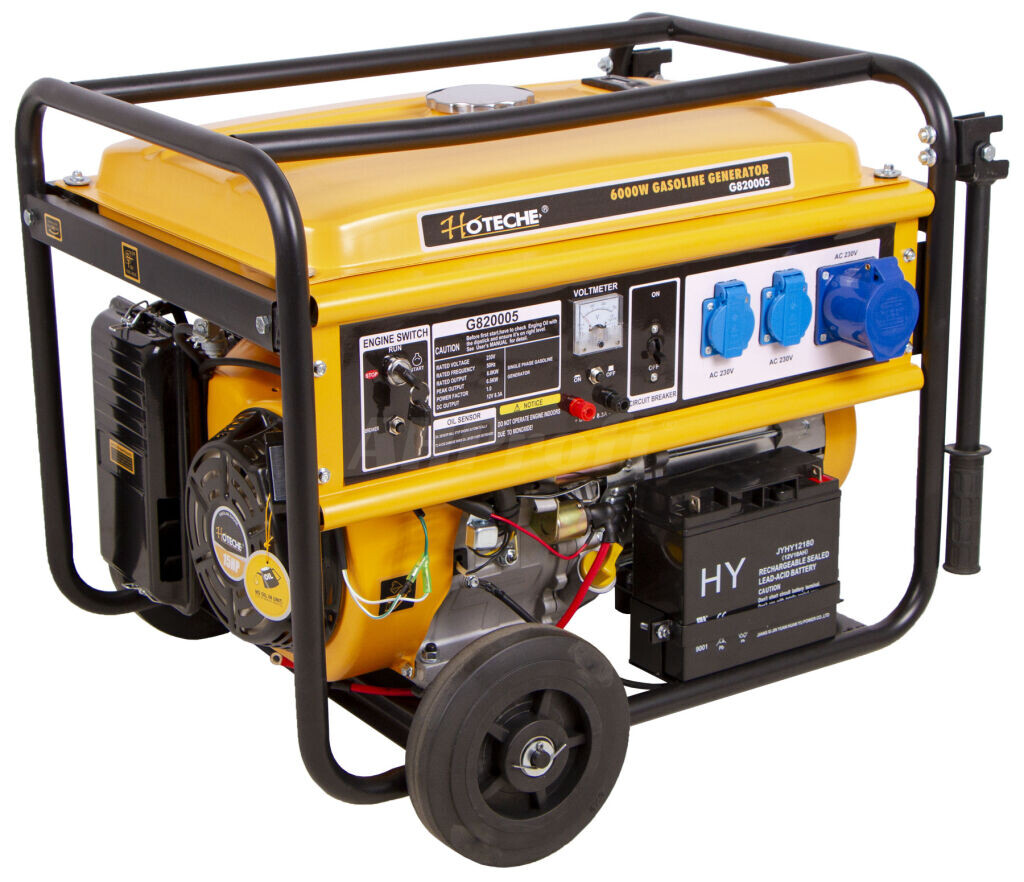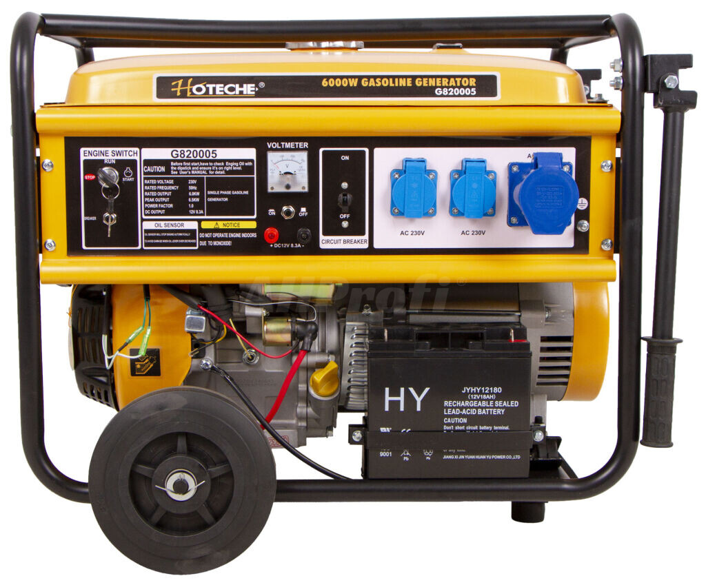 Benzínová elektrocentrála od značka Hoteche s výkonem 6000 W má jednofázový generátor elektrické energie, vzduchem chlazený, jednoválcový, 4-taktní motor, 1x výstup 12 V, 3x 230 V a voltmetr.