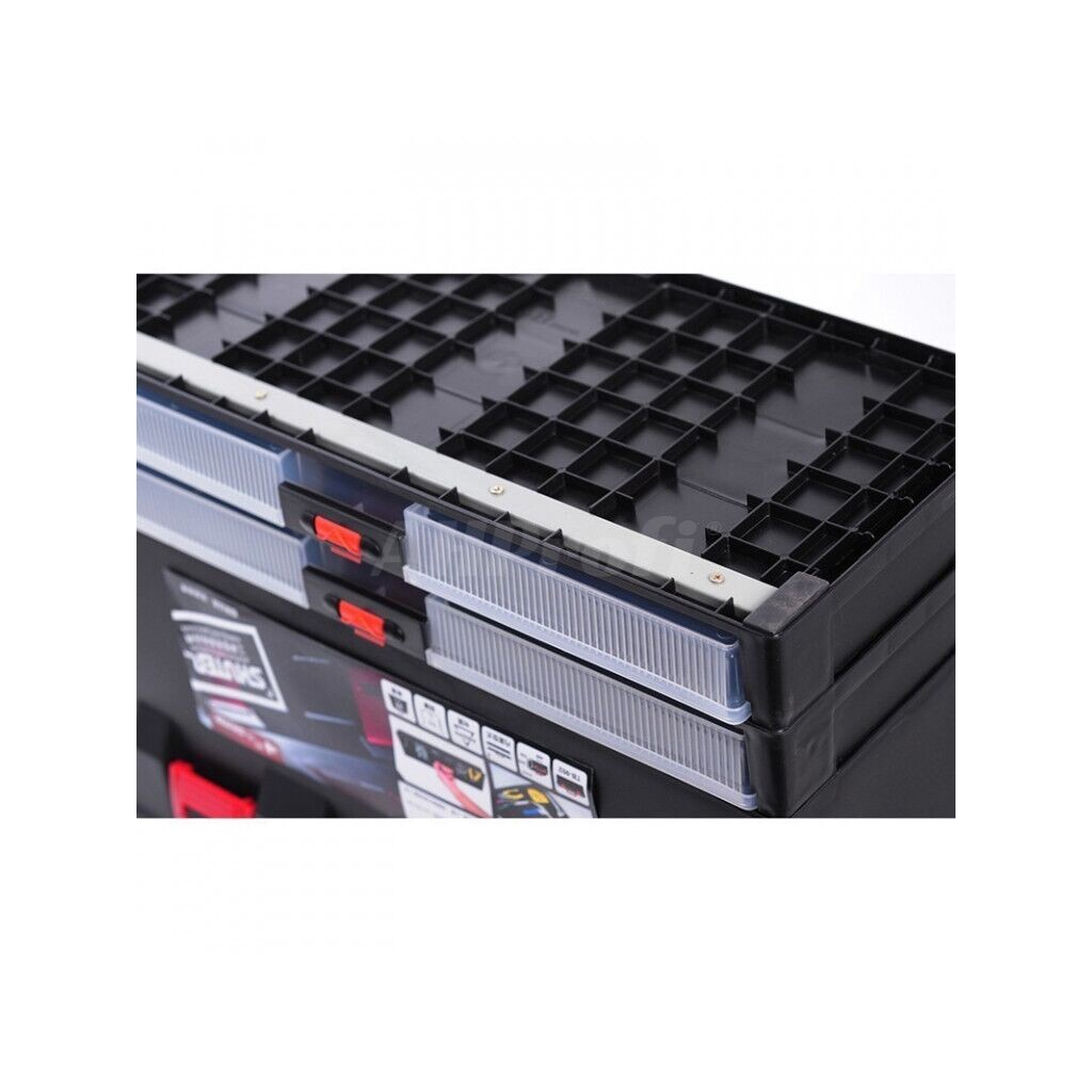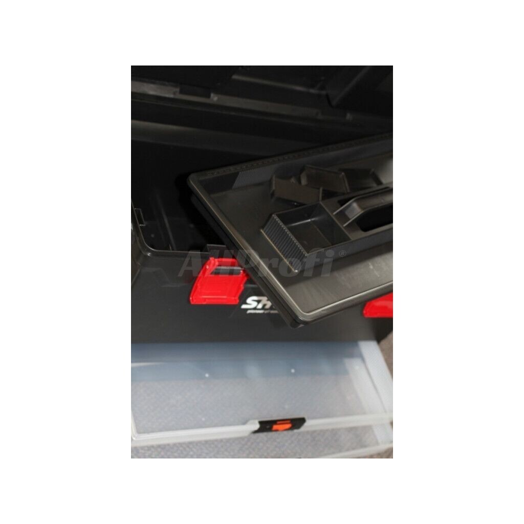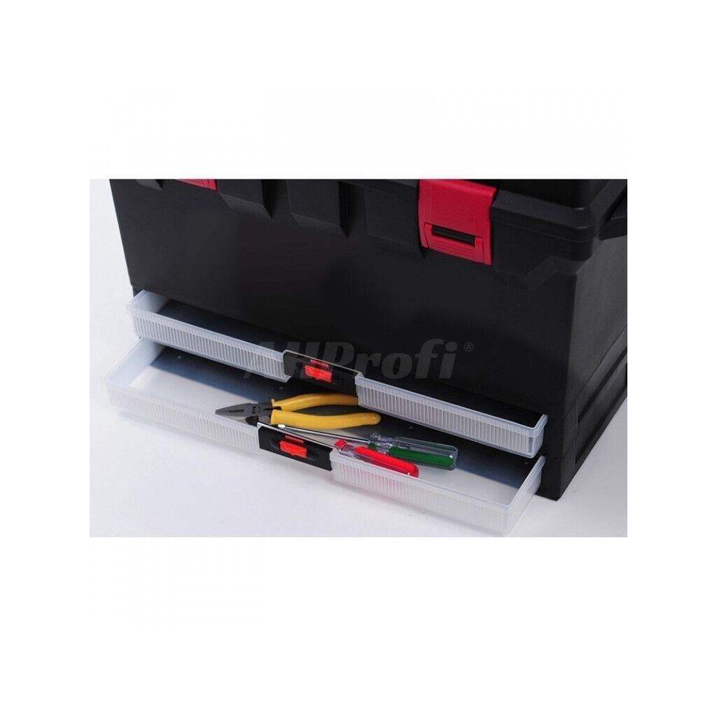 - 2 x vysouvací průhledné zásuvky pro ploché a řezné nástroje - uložením nožů, skalpelů a dalšího řezného nářadí zabráníte řezným ranám a odřeninám při hledání nářadí ve vnitřní části boxu,