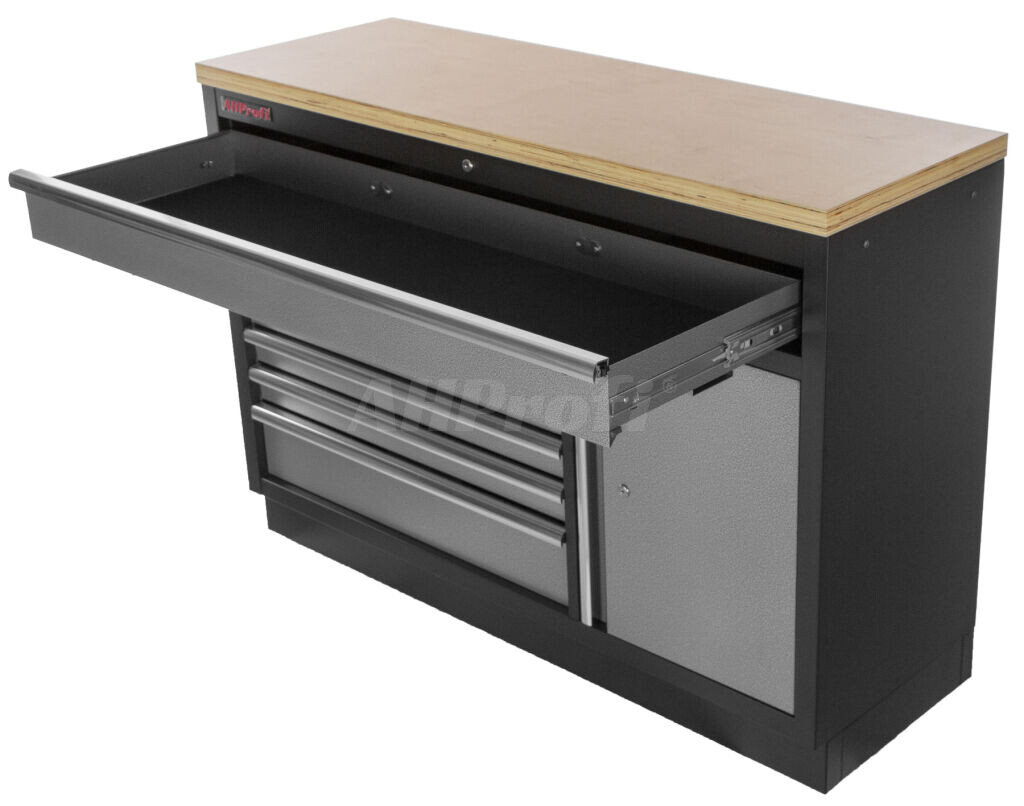 Široká celokovová dílenská skříňka se 7 zásuvkami, skříňkou a dřevěnou pracovní deskou.