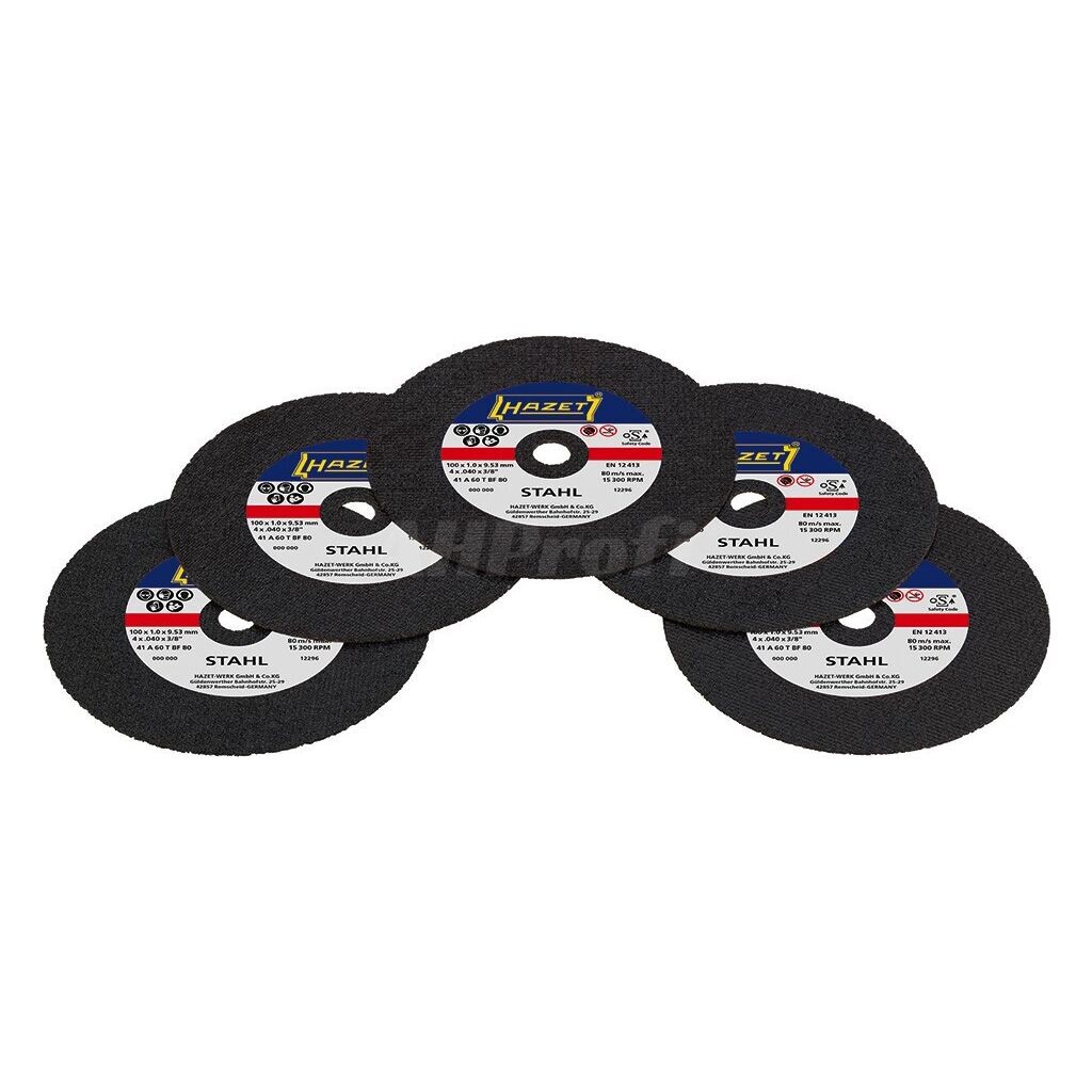 Rozbrušovací kotouče na plech, sada 5 ks, pro použití s hloubkovou bruskou HAZET 9033P-8. Max. rychlost řezu: 80 m/s, max. otáčky 15 300 ot./min. Rozměr 100 x 1 x 9,53 mm.