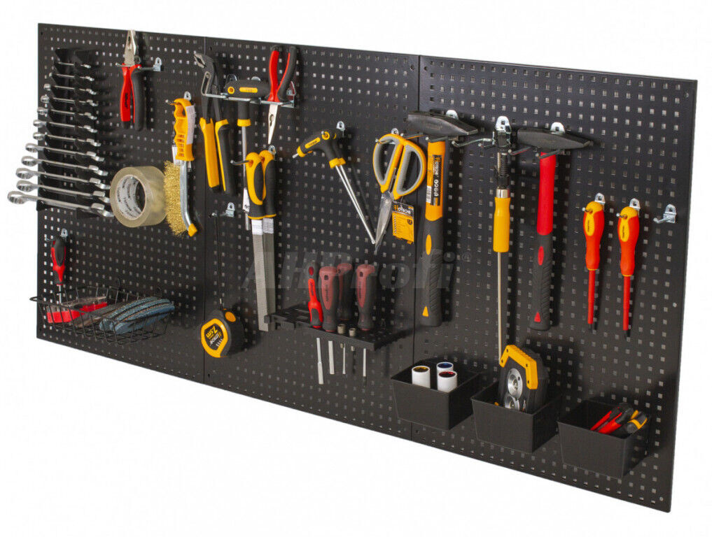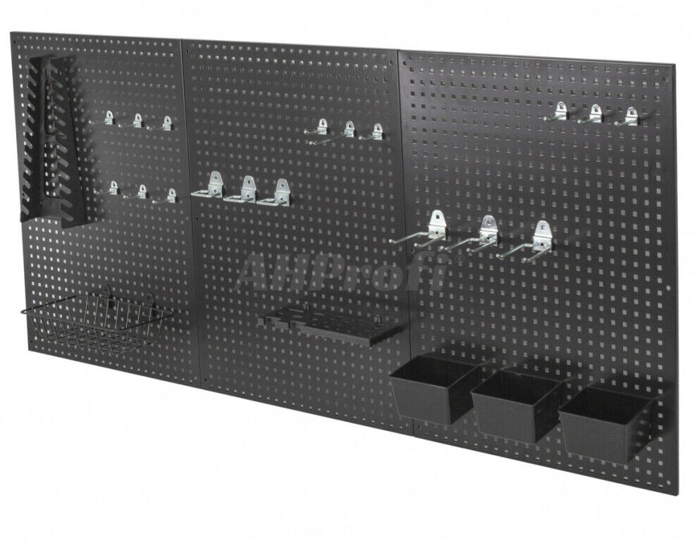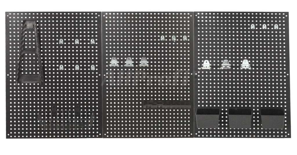 3 děrované desky s háčky a držáky pro organizaci nářadí. Síla desky 0,8 mm, celkové rozměry 1365 x 635 mm. Rozměr jedné desky 455 × 635 mm. Celkem 27 dílů včetně háčků, držáků a tří misek.