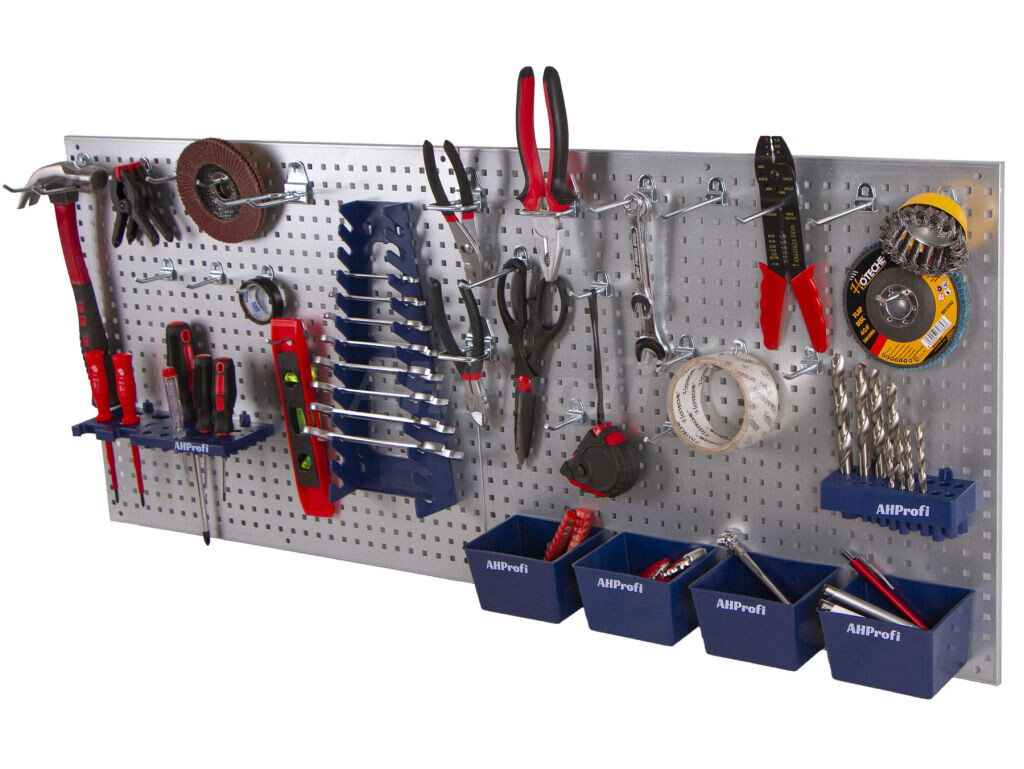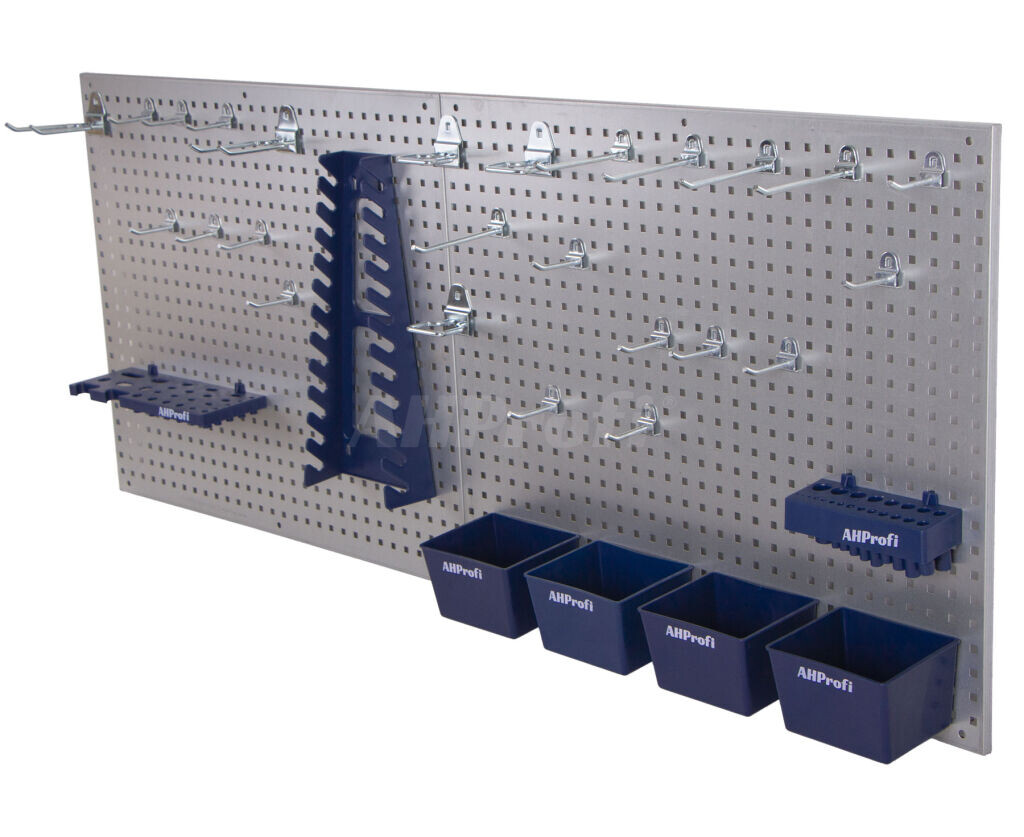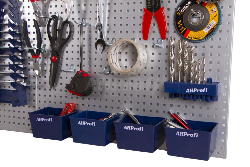 Příslušenství k deskám obsahuje: 15 krátkých háčků, 5 dlouhých háčků, 2 dvojité háčky, 3 držáky kleští, 4 plastové zásobníky, 1 držák klíčů, 1 držák šroubováků a 1 držák vrtáků.