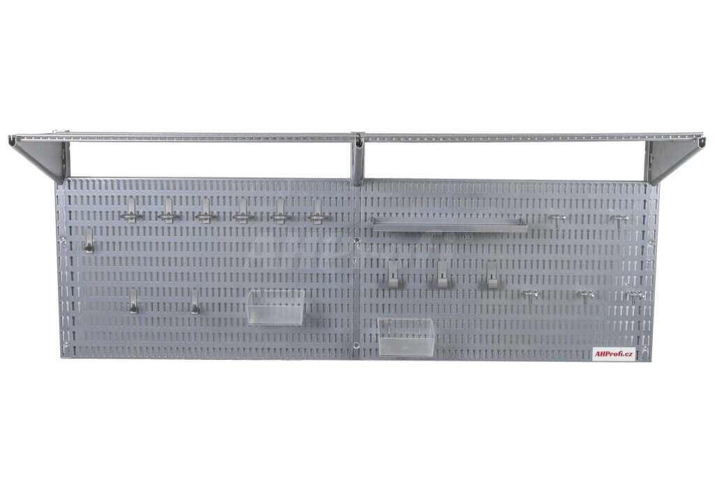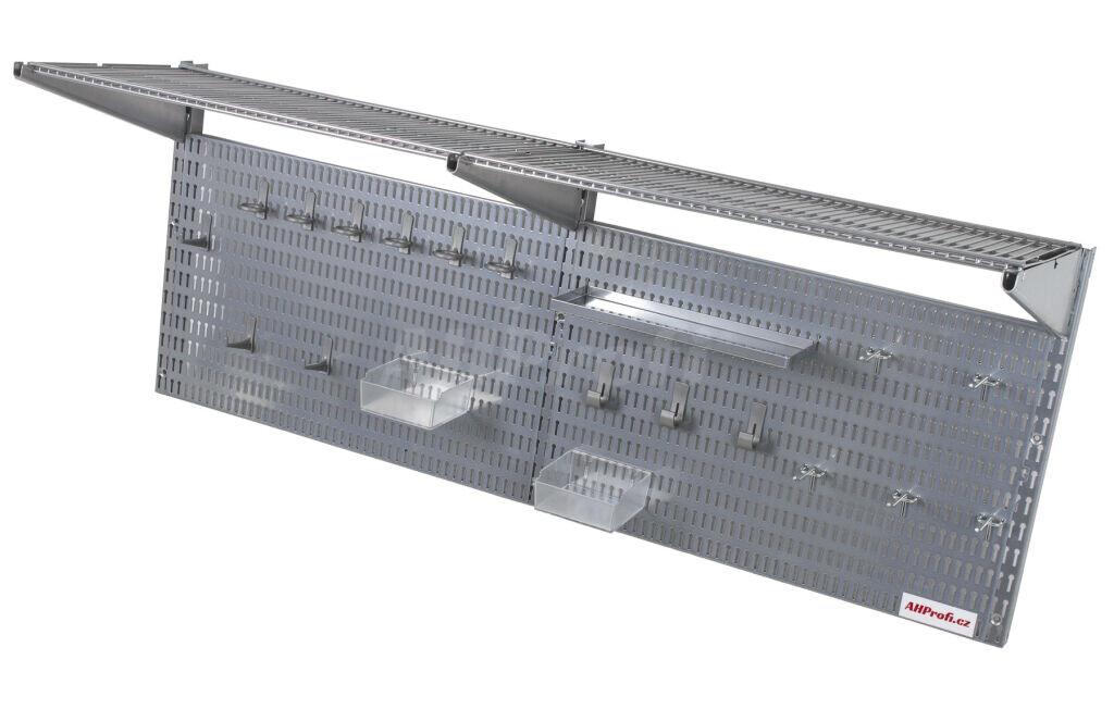 Děrovaná deska s komplexním příslušenstvím pro zavěšení nářadí a spojovacího materiálu, či police pro umístění větších přístrojů (např. v kufrech nebo krabicích).