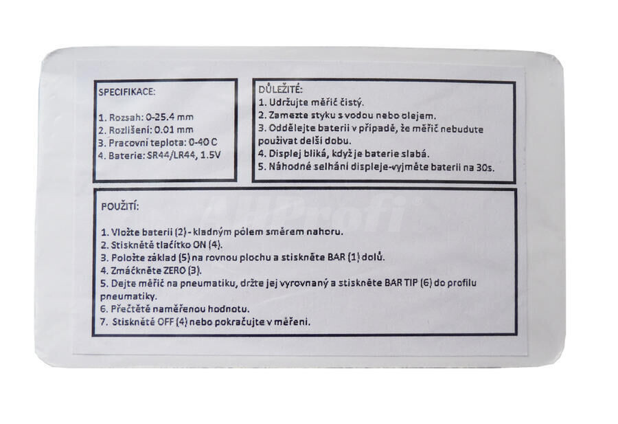 Rozsah měření: 0 - 24,5 mm, přesnost: 0,01 mm, baterie: SR44/LR44, 1,5 V.