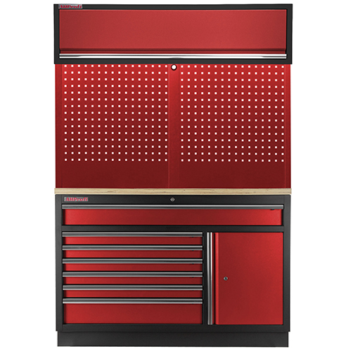Sestava 8 ks, 1360 x 495 x 2000 mm, dřevěná pracovní deska, modulární, celokovová, červená. Široká horní výklopná skříňka. Spodní skříňka: široká zásuvková, 2 děrované desky s roztečí 38 x 38 mm. Kvalitní dílenský nábytek vhodný pro profesionální servisy i domácí garáže a dílny.
