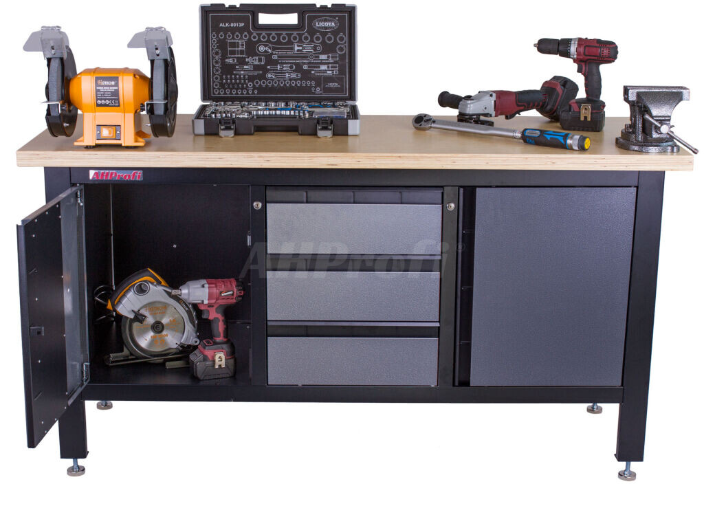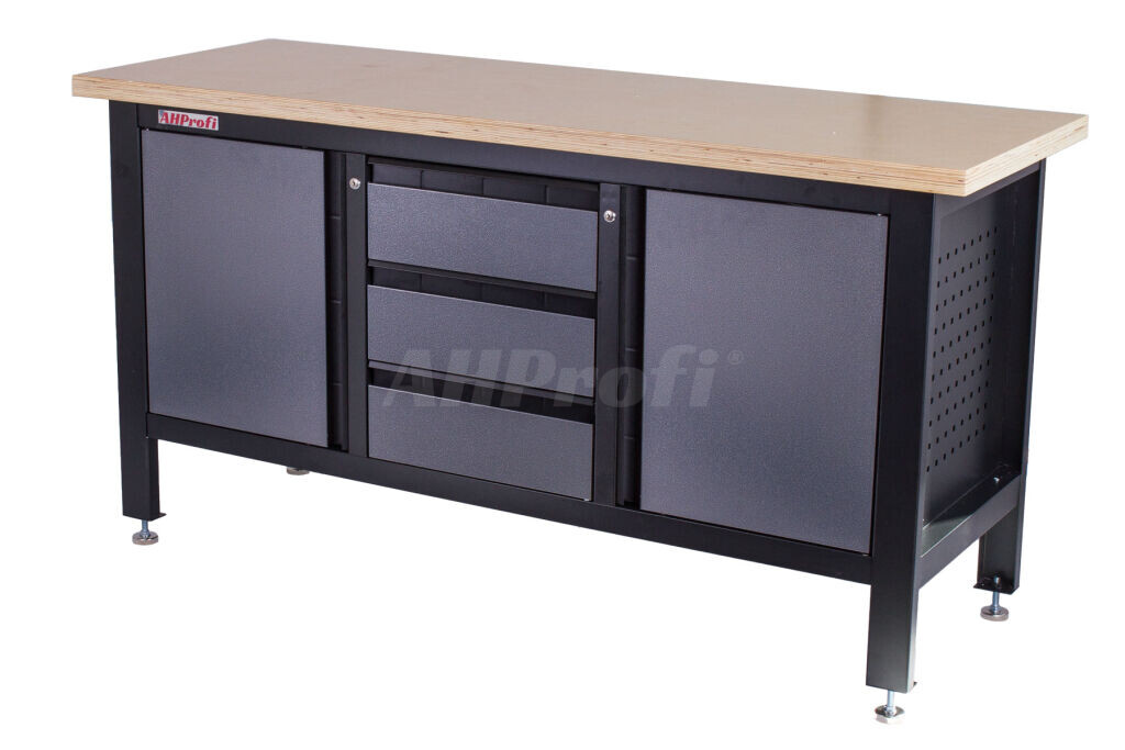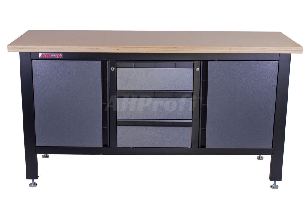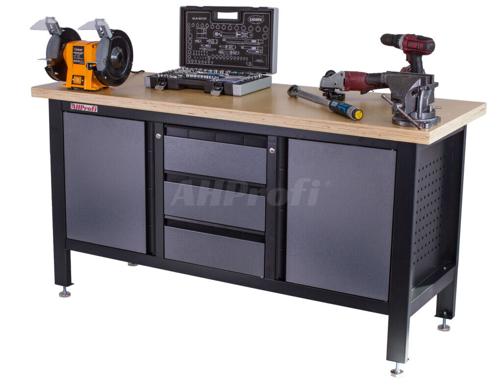 Profesionální kovový ponk vhodný pro nejnáročnější použití. Nosnost pracovního stolu je 300 kg. Je vybavený dřevěnou pracovní deskou o rozměrech 1690 x 600 mm, dvě skříňky a 3 šuplíky.