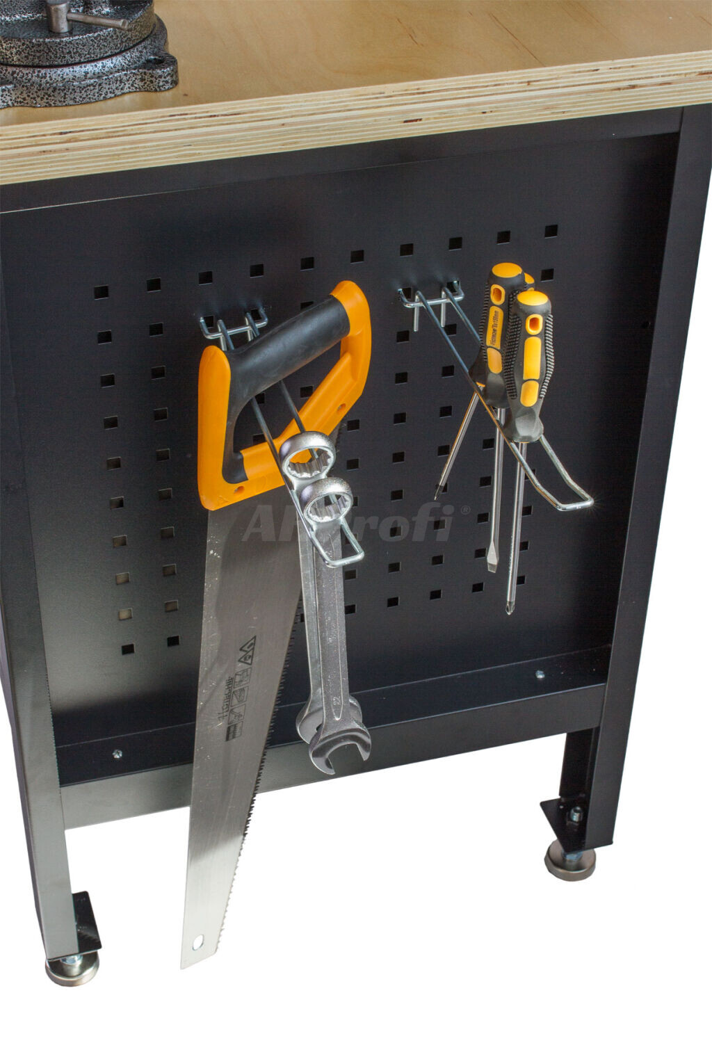 Na obou bocích je pracovní stůl vybaven děrovanou deskou.