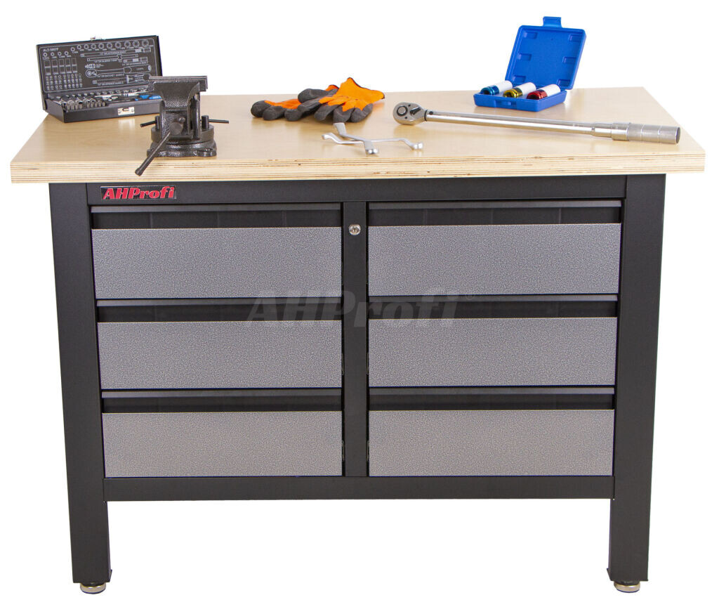 Kovový ponk o rozměrech 1200 x 865 x 600 mm. Dřevěná pracovní deska, 6 šuplíků, hmotnost 65 kg.