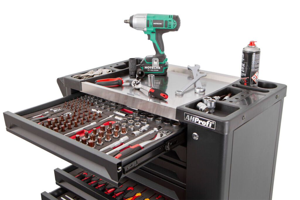 | Vozík obsahuje: | Bity, Ploché šroubováky, Imbus, Siko kleště, Kleště na pojistné kroužky, Vyražeče, Nástrčné klíče, Pilníky, Gola sada, Sekáče, Kleště, Torx, Nastavitelný klíč, Očkoploché klíče, Elektrikářské šroubováky, Sada bitů, Kladivo / palička, Štípací kleště, Křížové šroubováky, Dlouhé nástrčné klíče, Prodlužovací nástavce, Kardanový kloub, Šroubováky, Kombinované kleště, Nástrčné klíče na kola |