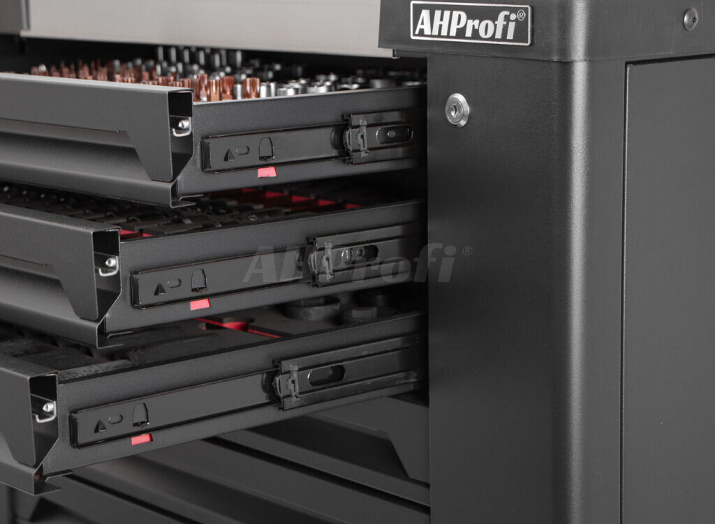 Vysoká konstrukce vozíku s množstvím úložného prostoru s celkem 10 zásuvkami a boční skříňkou umožnuje dokonalý přehled nad nářadím.