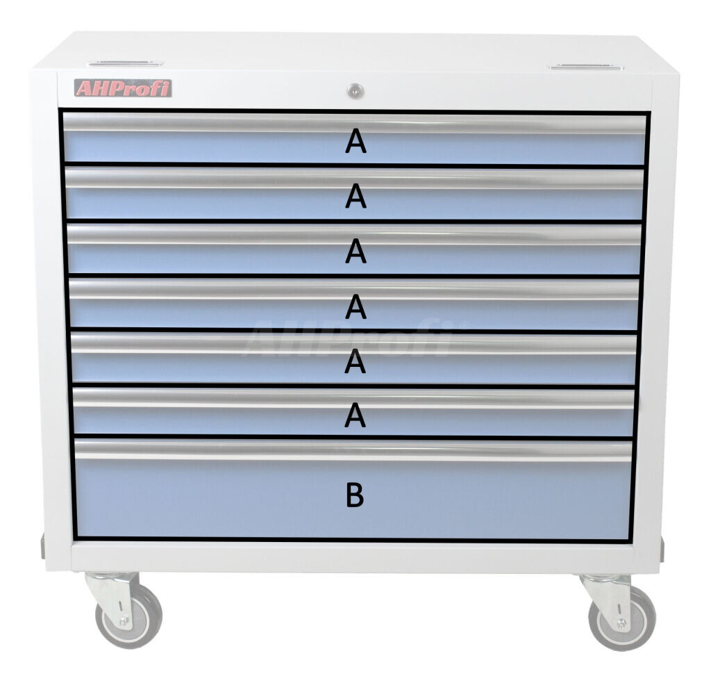 Součástí vozíku je 7 uzamykatelných zásuvek pro uložení výplní dílenského vozíku s ručním nářadím. Zásuvky jsou osazeny kuličkovými ložisky v pojezdech, čímž se zvyšuje jejich nosnost bez vlivu na výbornou vlastnost výjíždění/zajíždění.