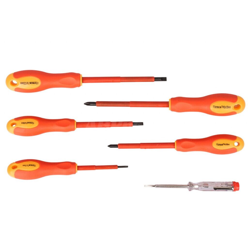 Elektrikářské šroubováky VDE v sadě 6 kusů se zkoušečkou napětí značky Hoteche umožňují bezpečnou práci se zařízeními pod napětím do 1000 V.