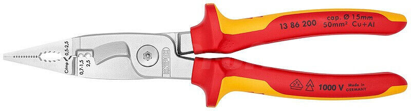 Multifunkční kleště pro elektroinstalace- na uchopování plochého i kulatého materiálu, ohýbání, odstranění otřepu, štípání kabelů, odizolování a krimpování koncových dutinek. 6 funkcí v jedněch kleštích. Hladké úchopové plochy na hrotu pro uchopování jednotlivých vodičů bez poškození- profilované úchopové plochy a hořákový otvor pro uchopování plochého i kulatého materiálu. Výrazná vnější hrana na čelisti pro úpravu podomítkových zásuvek a odstraňování otřepu u průchodových otvorů. Otvory pro odizolování na vodiče 0,75-1,5 mm? a 2,5 mm?. Krimpovací hnízdo na koncové dutinky 0,5-2,5 mm?. Kabelové nůžky s přesnými břity (indukčně kalené) na měděné a hliníkové kabely do 5 x 2,5 mm? / ? 15 mm. Uchopení bez úplného rozevírání kleští (inteligentní přídržný mechanismus u verze s otevírací pružinou) Břit zůstane uzavřený a chráněný.. štíhlá konstrukce kvůli lepší přístupnosti. šroubovaný kloub: Přesný chod kleští bez vůle.