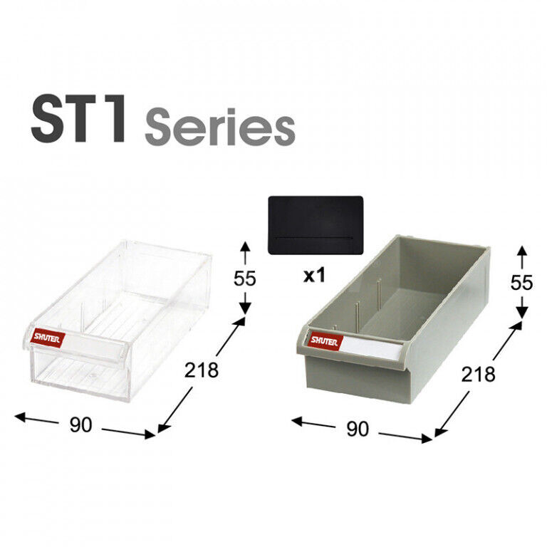 - Jednotlivé plně průhledné plastové boxy o rozměrech (Š x V x H) 90 x 55 x 218 mm.