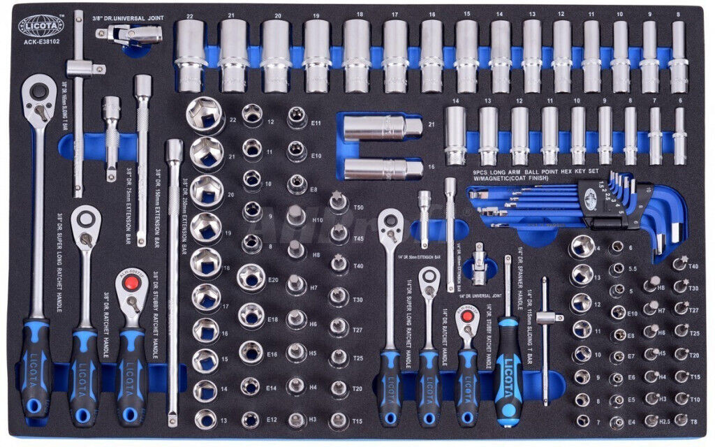 Velká pěnová výplň pojízdných skříněk s gola sadou 1/4" a 3/8", profesionální značka LICOTA, obsahuje celkem 121 kusů nářadí. Rozměr (š x h x v): 57,2 x 38 x 3,7 cm.