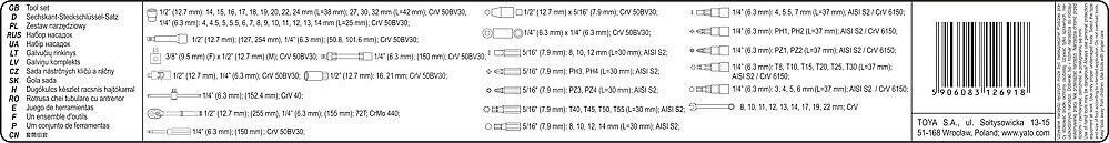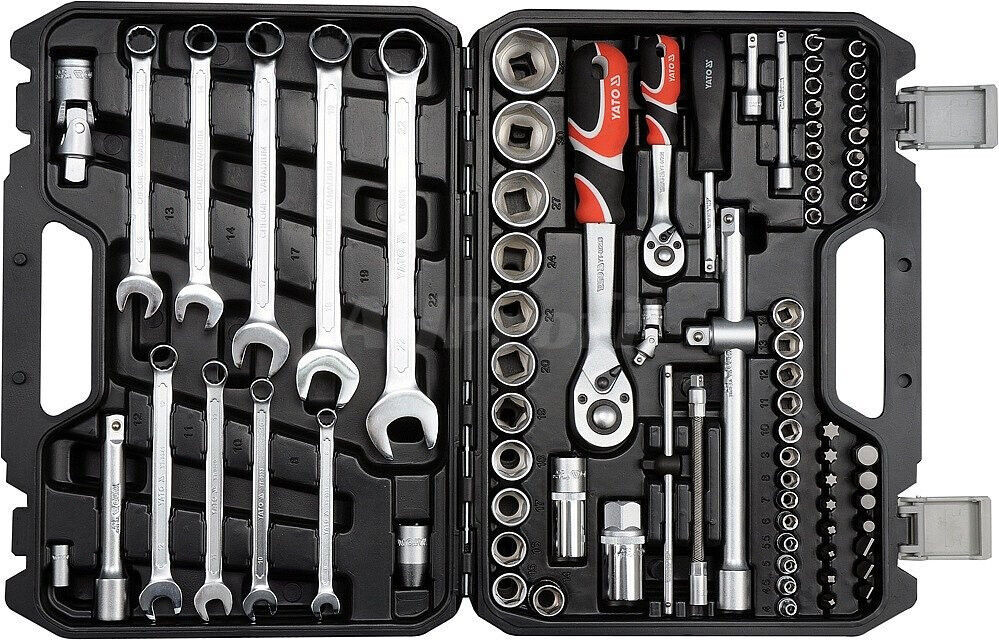 Sada nástrčných klíčů YATO, 82 kusů v plastovém kufru, 1/2" a 1/4", obsahuje mj. ořechy a ráčny, vratidla, prodlužovací a kloubové adaptéry, bity a očkoploché klíče.