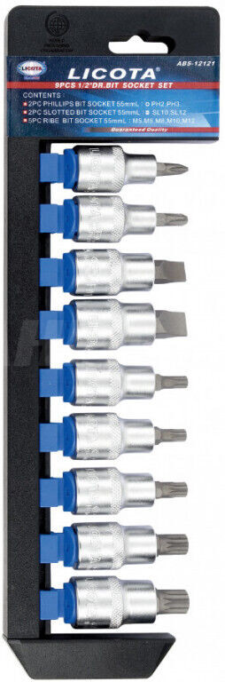 - Sada 9 nástrčných bitů 1/2" od značky LICOTA.
