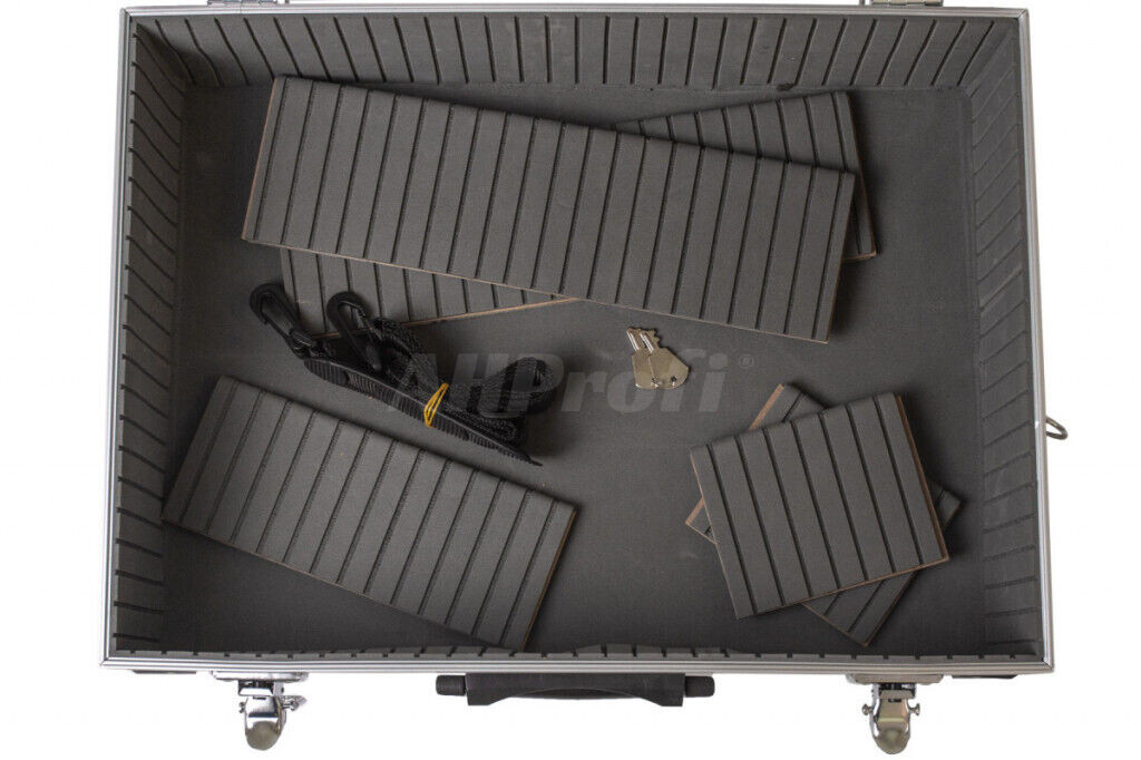 Hliníkový kufr na nářadí o rozměrech (š x h x v): 460 x 330 x 150 mm. Kufr je lehce přenosný díky madlu, nebo přídavnému popruhu na ramena.
