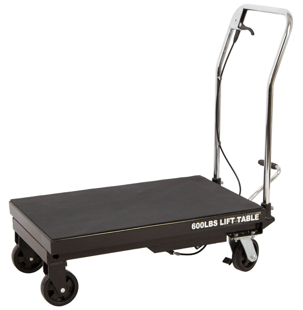 Profesionální hydraulický zvedací stůl, dvojitý nůžkový mechanismus, 4 pojezdová kola, nosnost 270 kg, zdvih 270-760 mm.