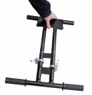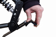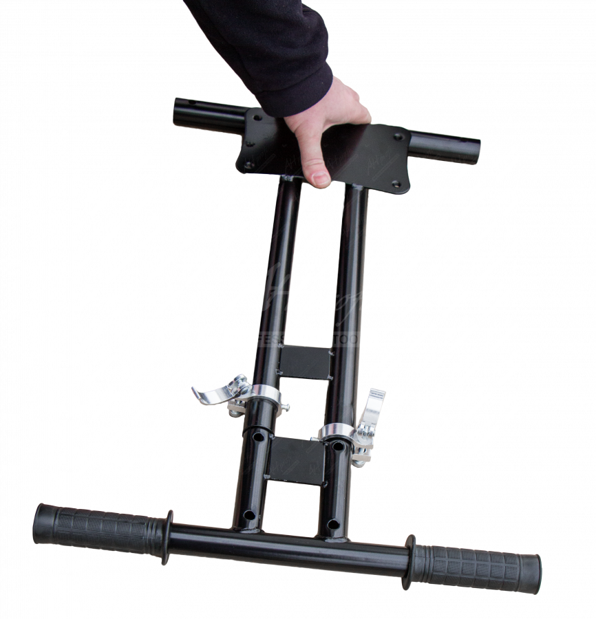 Jako další se montují madla s odpružením. Nejprve se na plošky nasunou gumové podložky jako chrániče (vroubkováním dolů) a úzkými otvory protáhnete suché zipy. Následně se madla vsunou do rámu pro sedadlo tak, aby madla směřovala ke kolu. Do otvoru vložíte šroub a matkou utáhnete stejně jako při montáži kola.
