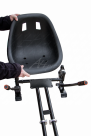 Na závěr přichází montáž sedadla. Sedadlo přiložíte na největší plošku rámu tak, aby otvory na sedadle pasovaly na otvory v rámu, a přišroubujete krátkými šrouby stejně jako kolo a madla.