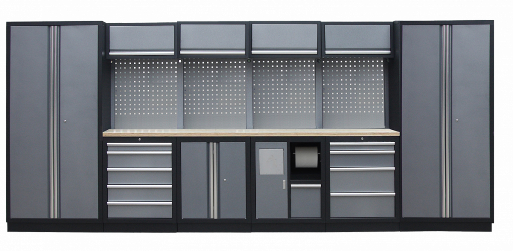 Sestava 21 ks, 4535 x 495 x 2000 mm, dřevěná pracovní deska, modulární, celokovová, šedá. Horní skříňky: 4 výklopné. Spodní skříňky: dvoukřídlá / s košem / 4 a 5 šuplíková. Vysoké skříně: 2 široké. 4 děrované desky s roztečí 38 x 38 mm. Kvalitní dílenský nábytek vhodný pro profesionální servisy i domácí garáže a dílny.