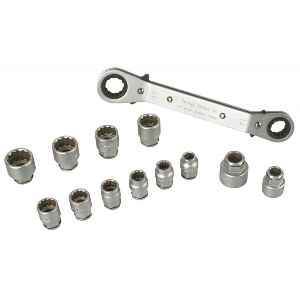 V sadě naleznete ráčnový oboustranný klíč o základních velikostech 14 a 17 mm a dále 12 ks nástrčných adaptérů.
