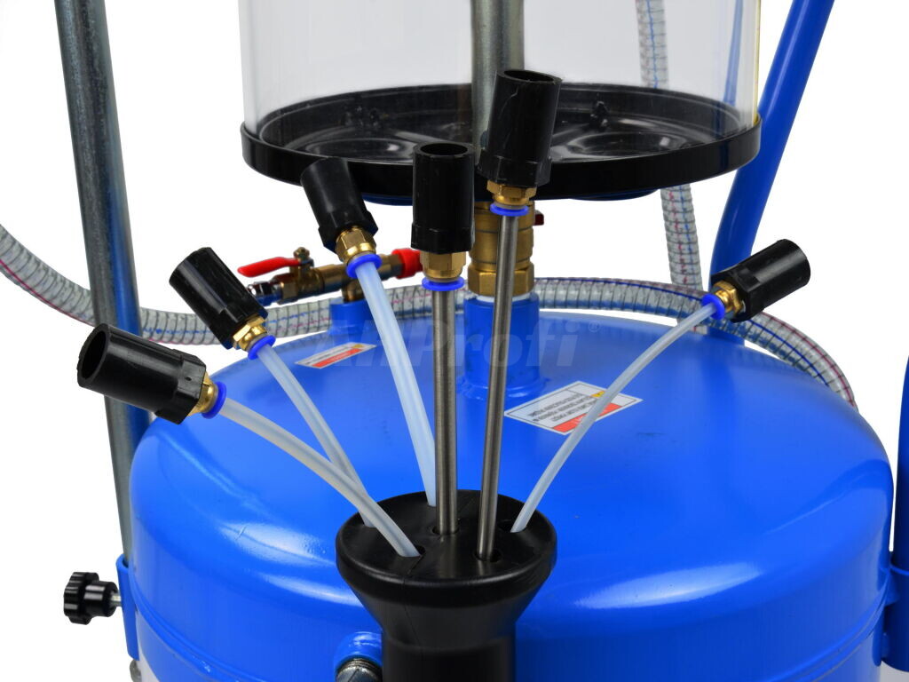 Jímka je vybavena odsáváním pomocí stlačeného vzduchu. V zásobníku se vytvoří podtlak a poté lze i bez trvalého napojení na stlačený vzduch odsávat olej pomocí pružné hadice a jednoho z pěti adaptérů.