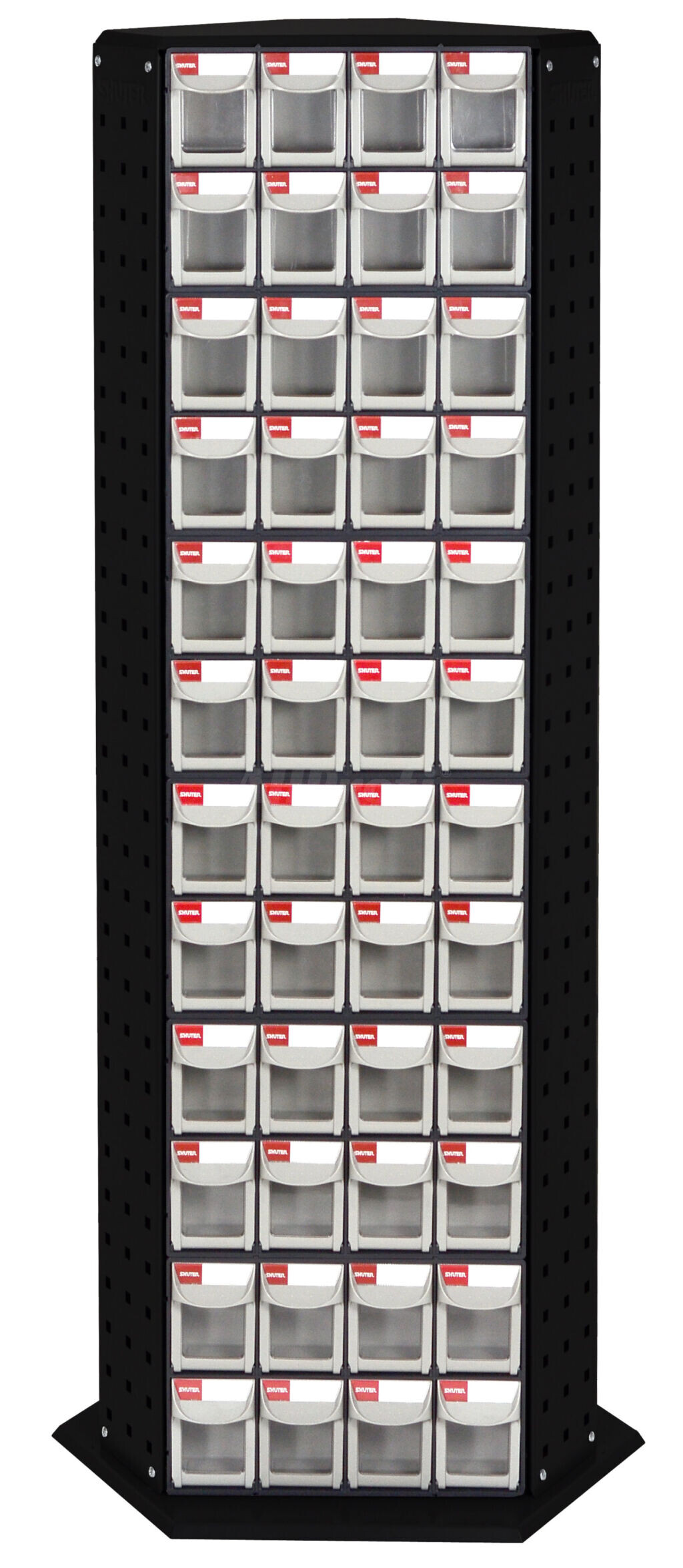 Zásuvky mají transparentní čelo, jsou opatřeny madlem a popisovacím štítkem pro přesnou identifikaci uloženého materiálu. Díky možnosti otočení o 360° extrémně spoří prostor v dílně a zefektivňuje skladování.