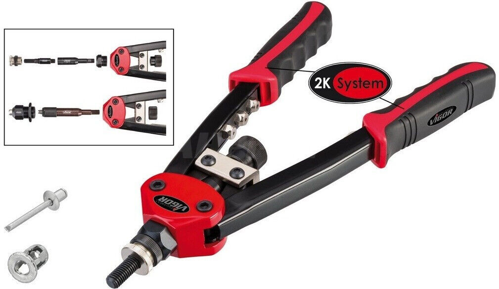 Univerzální nýtovací kleště od kvalitní německé značky VIGOR, pro nýtovací matice M5-M10 a mosazné, měděné, ocelové a nerezové nýty 3.2-6.4 mm.