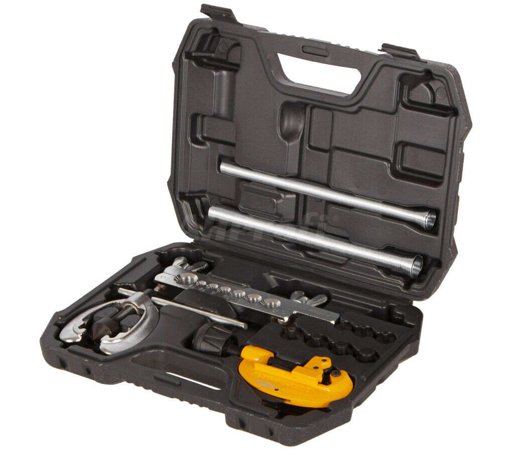Pertlovací sada na hliníkové a měděné brzdové trubky v kompletní sadě i s řezačkou trubek a přípravky pro jejich ohýbání.