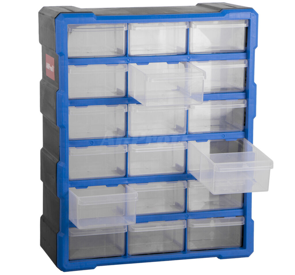 Plastový organizér s 18 zásuvkami lze jednoduše zavěsit na zeď, nebo např. z boku skříně, dílenského vozíku apod. Je možné ho postavit na ponk, nebo pracovní stůl a slouží pro uložení montážního materiálu a drobného dílenského vybavení.
