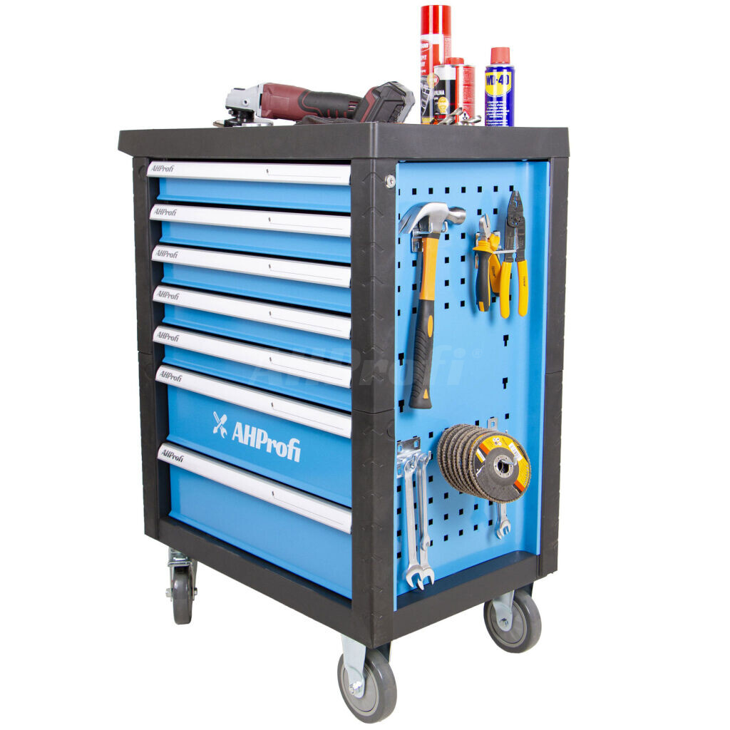 Modrý pojízdný kovový dílenský vozík se 7 šuplíky je vybavený nářadím nezbytným pro práci v dílně.