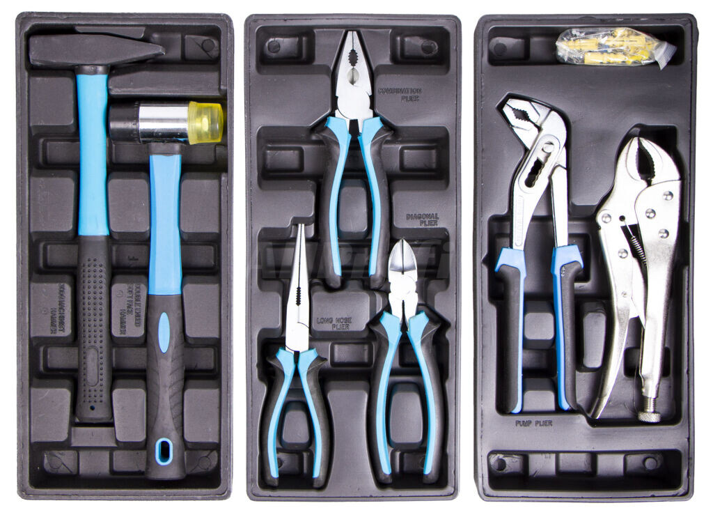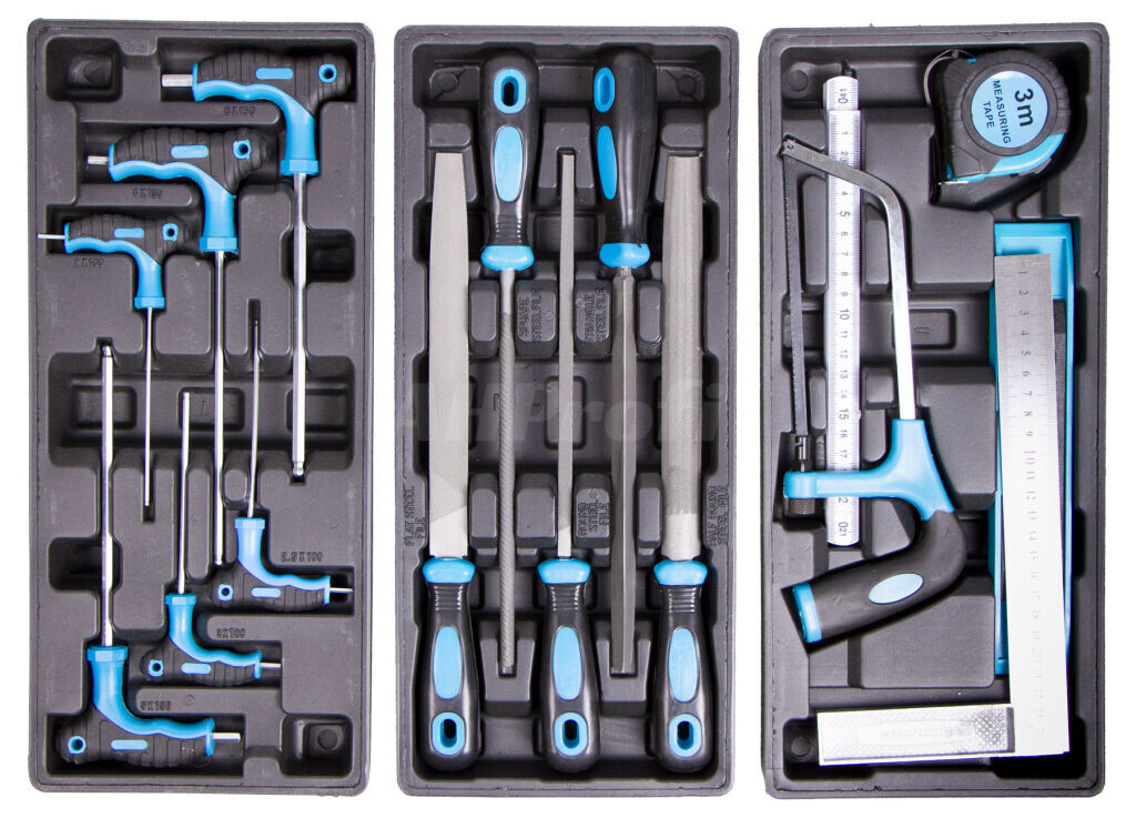 | Vozík obsahuje: | Ploché šroubováky, Úderové šroubováky, Metr, Hodinářské šroubováky, Pilka, Křížové šroubováky, Štípací kleště, Kladivo / palička, Elektrikářské šroubováky, Očkové klíče, Prodlužovací nástavce, Siko kleště, Úhelník, Imbus, Dlouhé nástrčné klíče, Očkoploché klíče, Kombinované kleště, Pilníky, Samosvorné kleště, Úhloměr, Gola sada, Bity, Nástrčné klíče, Kardanový kloub |