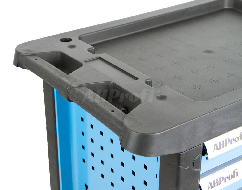 - Dílenský vozík je celokovový a hrany má opláštěny tvrzeným plastem pro zamezení poškození.