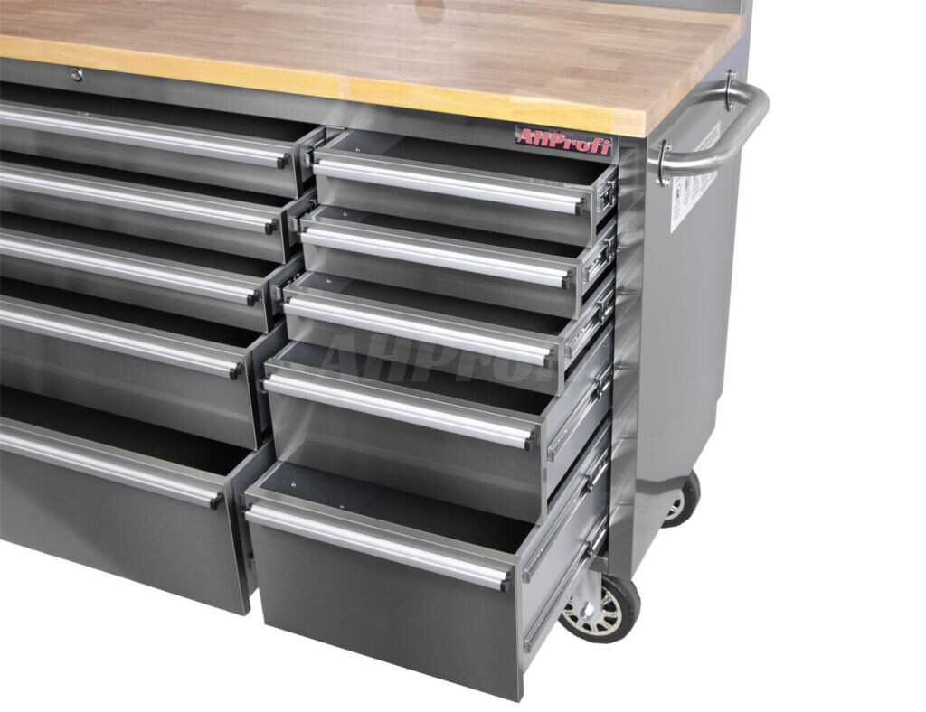 Dílenský vozík s dřevěnou pracovní deskou a horními skříňkami, 15 zásuvek - AHProfi