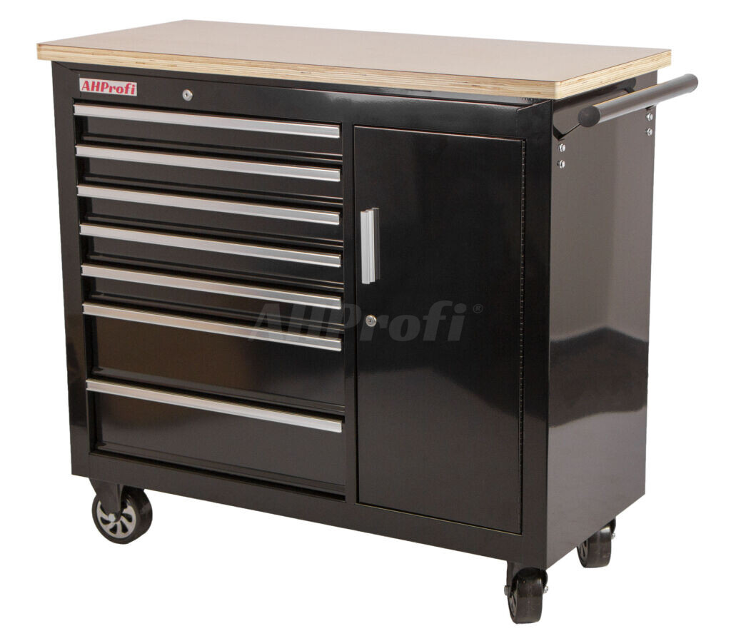Černý kovový dílenský vozík se 7 šuplíky a skříňkou. Vozík je vhodný na nářadí nezbytné pro práci v dílně nebo servisu.