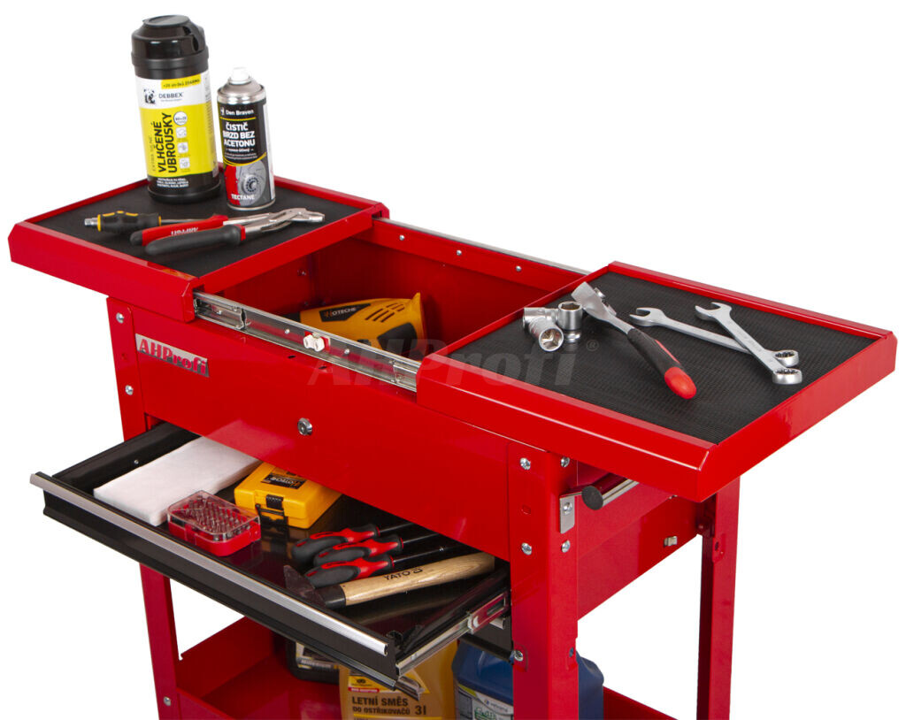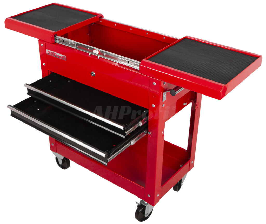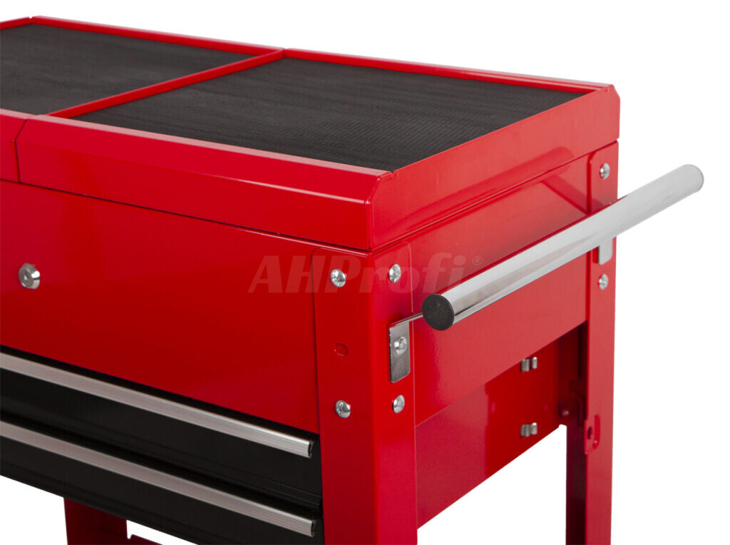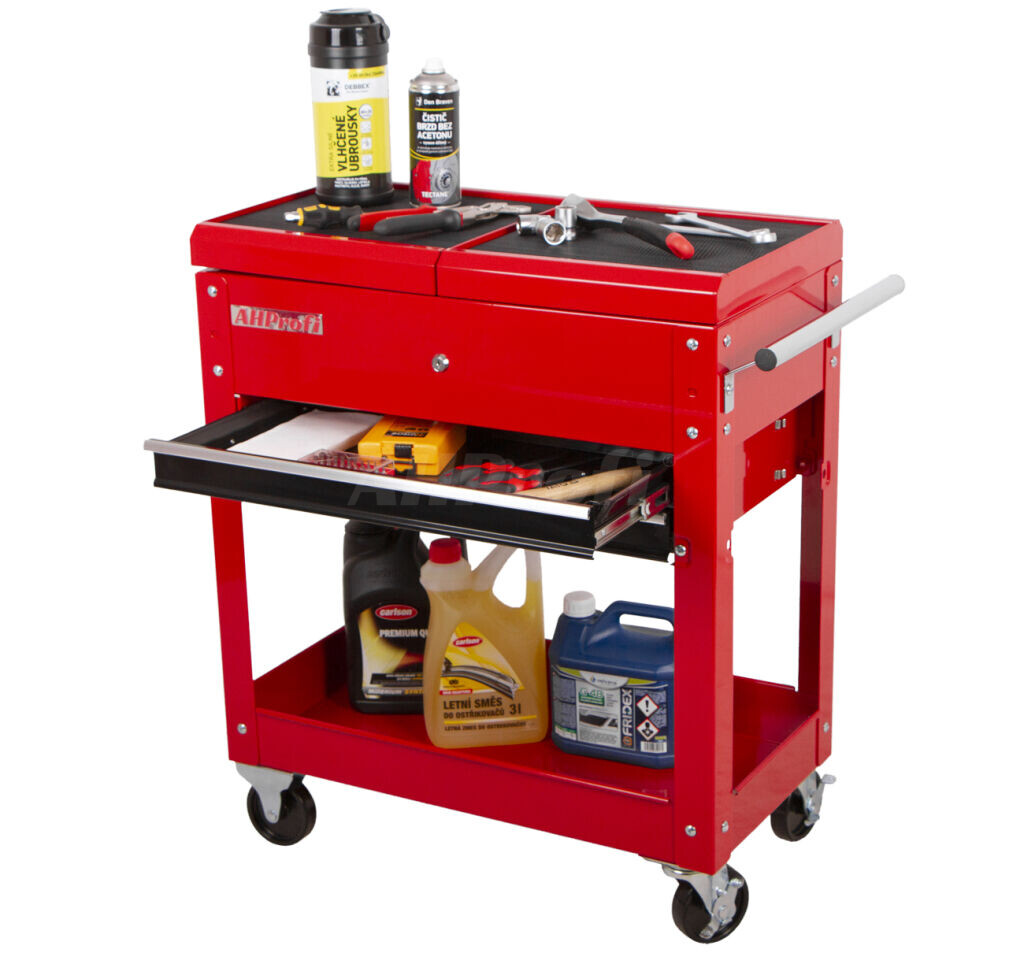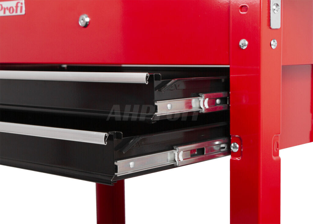 Profesionální pojízdný pracovní stolek s velkým úložným prostorem, 2 uzamykatelnými zásuvkami s kuličkovými pojezdy. 4 kolečka, z toho 2 s brzdou.
