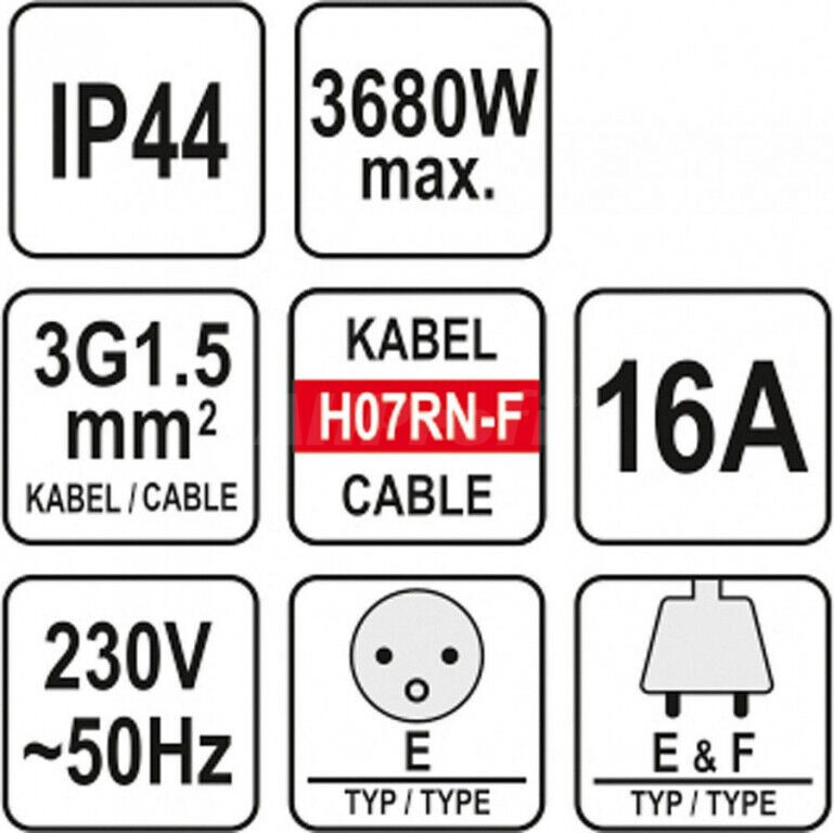 Prodlužovací kabel 20m, 3 zásuvky, IP44, průřez vodiče 3x1,5mm2, prachová krytka, 230V, 16A