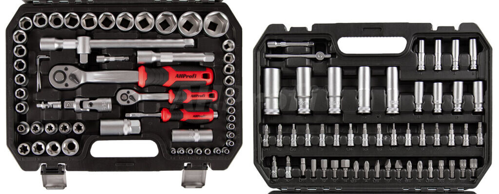 - Komplexní obsah včetně ráčen, nástrčných klíčů, nástavců, bitů aj.