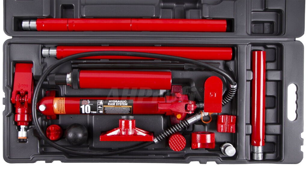 Konstrukci tvoří hydraulický válec se silou 10 tun a kvalitní příslušenství uložené v praktickém plastovém kufru s kolečky pro snadnou manipulaci.