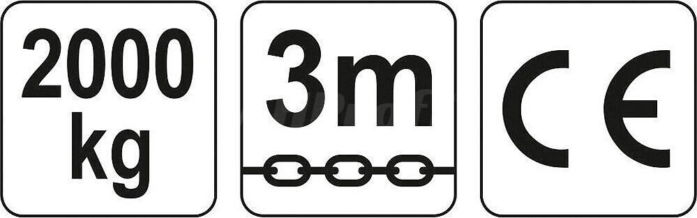 Řetěz a hák byl speciálně navržen pro výrazné zlepšení odolnosti a bezpečnosti. Ovládací řetěz má délku 2 m a výška zdvihu je 3 m. Maximální zatížení 2T.