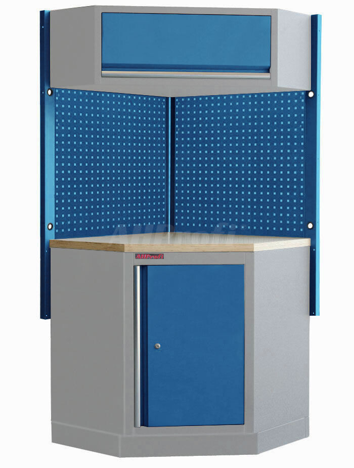 Sestava 9 ks, 940 x 495 x 2000 mm, dřevěná pracovní deska, modulární, celokovová, modrá. Rohová horní výklopná skříňka. Rohová spodní skříňka. 2 děrované desky s roztečí 38 x 38 mm. Kvalitní dílenský nábytek vhodný pro profesionální servisy i domácí garáže a dílny.