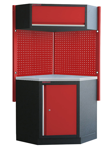 Sestava 9 ks, 940 x 495 x 2000 mm, nerezová pracovní deska, modulární, celokovová, červená. Rohová horní výklopná skříňka. Rohová spodní skříňka. 2 děrované desky s roztečí 38 x 38 mm. Kvalitní dílenský nábytek vhodný pro profesionální servisy i domácí garáže a dílny.