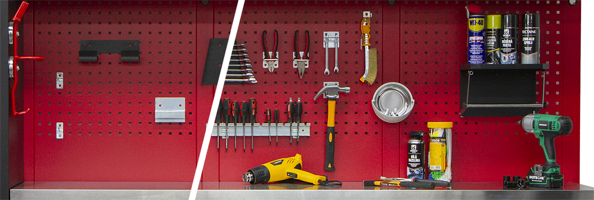 Držáky a háčky na nářadí, police i úložné boxy snadno zaháknete na perforovaný panel s roztečí děr 38 x 38 mm.