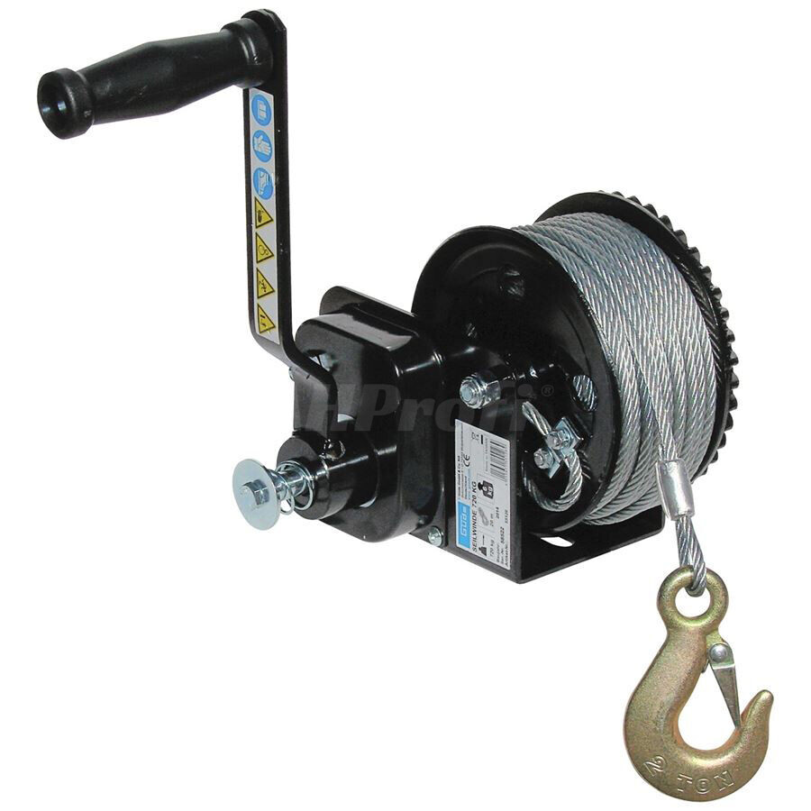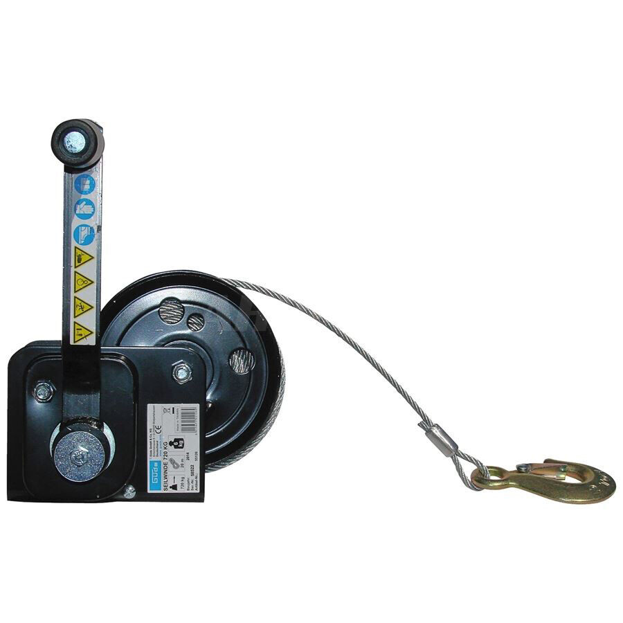 Ruční lanový naviják s integrovanou brzdou, určený k přitahování břemen (→ maximální zatížení v tahu: 720 kg).