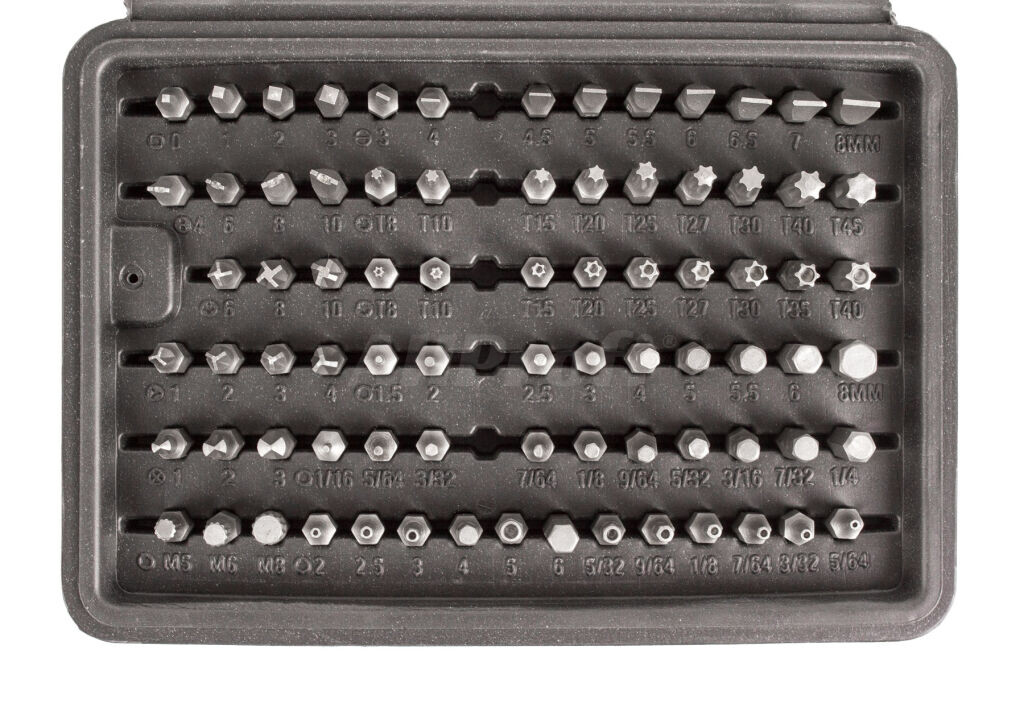 Komplexní sada bitů v plastovém kufru se 100 díly. Sada se dobře skladuje i přenáší a snadno udržíte pořádek mezi jednotlivými bity. Díky přehlednému uložení lze snadno kontrolovat kvalitu/unavenost jednotlivých dílů a případně je vyměnit. Bity jsou obsaženy v nejběžněji používaných rozměrech, takže se hodí do profi dílny i pro domácí dílnu.