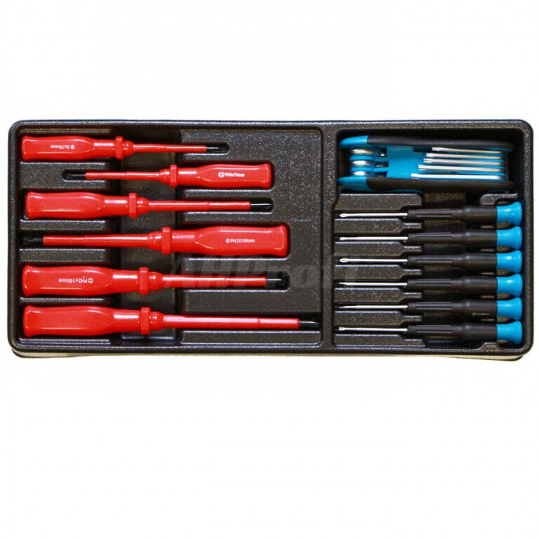 Elektrikářské a hodinářské šroubováky ve vložce do dílenského vozíku, 13 ks.