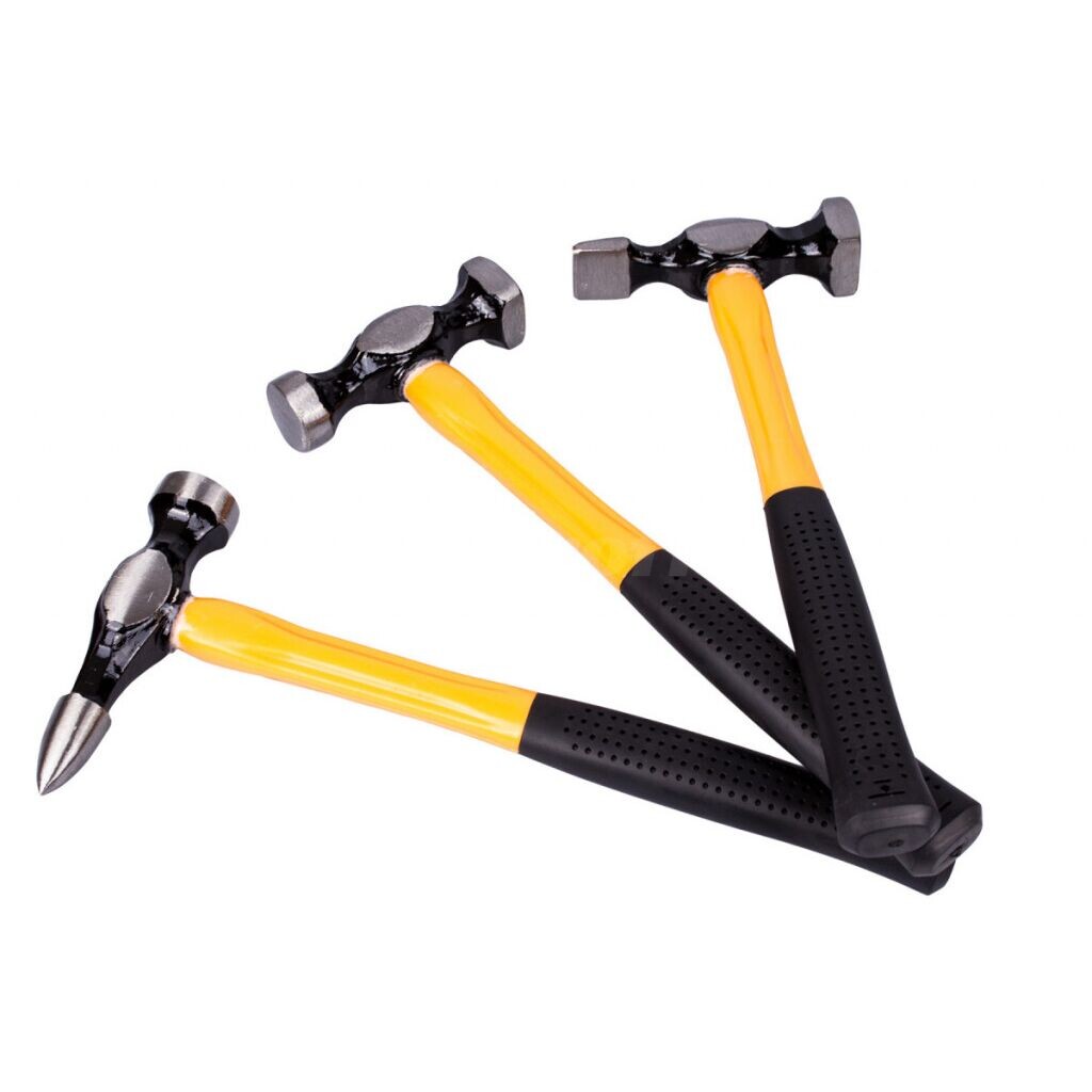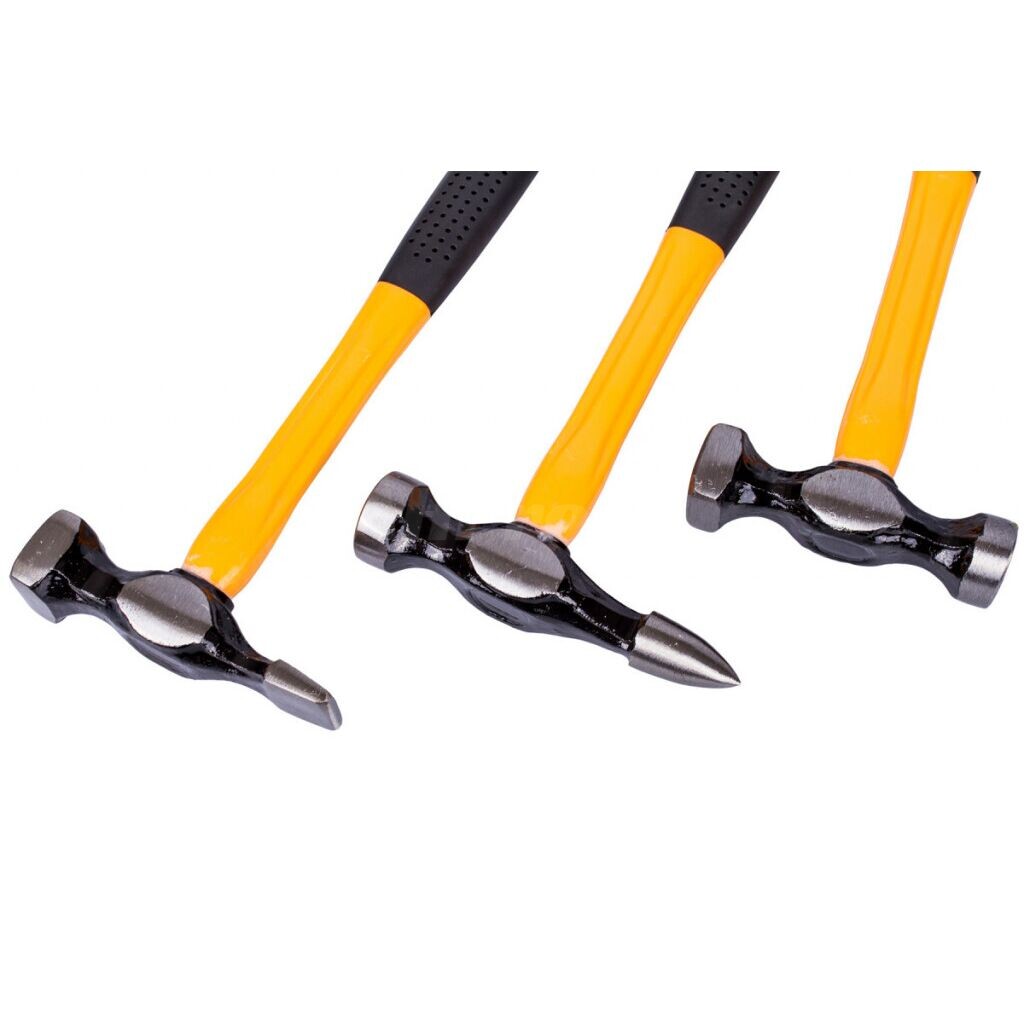 Celkem 3 karosářské vyklepávací kladiva o délce 283 mm mají sklolaminátové topůrko s děrovanou rukojetí pro neklouzavý úchop. Kladiva i 4 příložné babky různých rozměrů a tvarů mají broušené pracovní plochy.